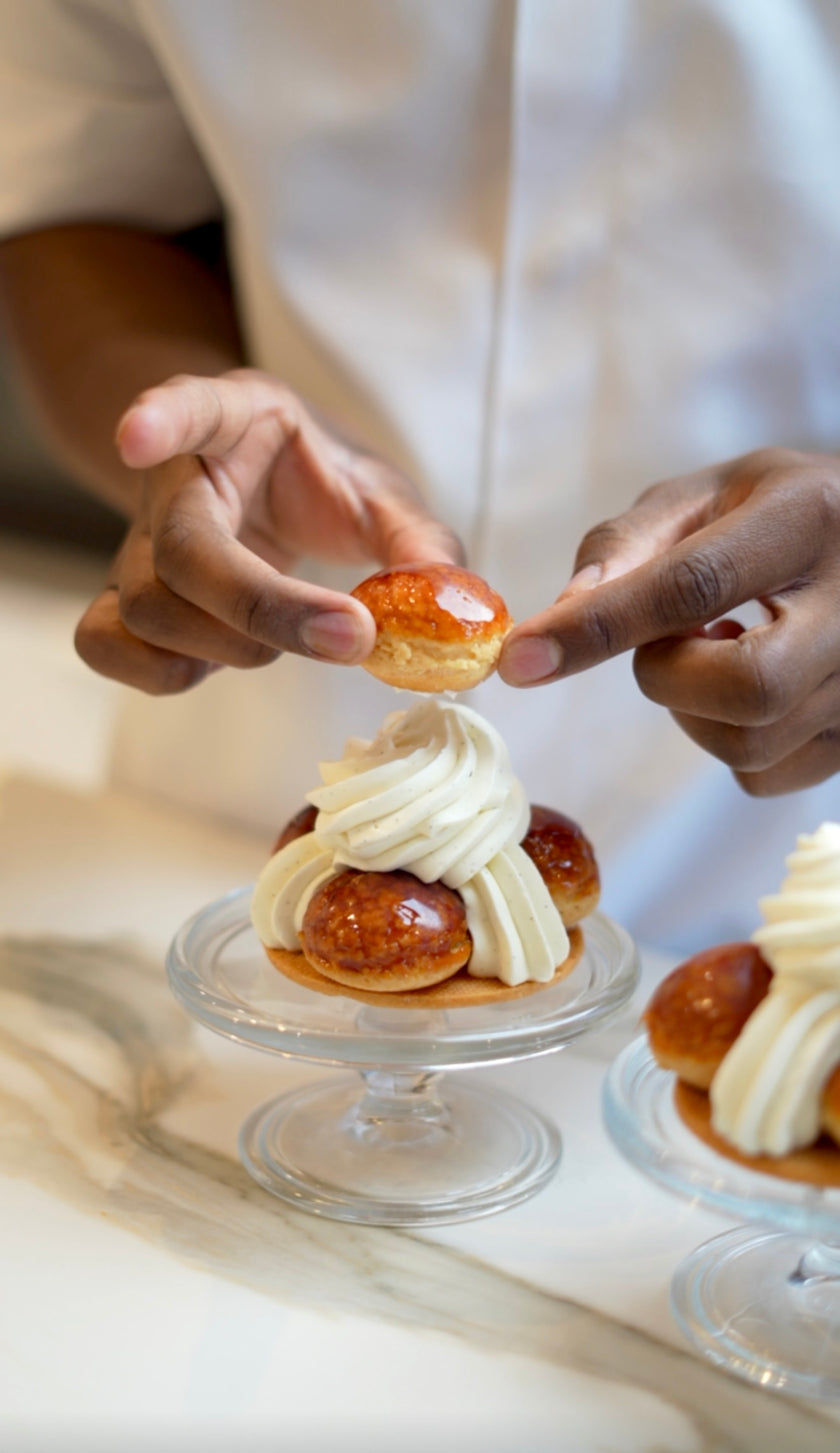raffinement, à la tradition française et à la beauté du geste. Chaque entremets, chaque chou, chaque tarte raconte une histoire celle d’un homme passionné, d’un parcours d’excellence et d’un retour aux sources pour transmettre le goût du sublime.